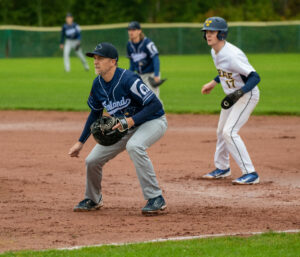 Miesten baseball maajoukkueen 1-vahti Mikko Kaijansinkko valppaana Ruotsi maaottelussa.