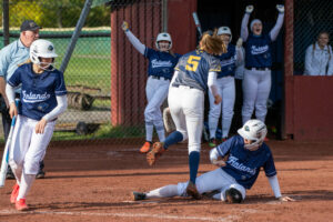 Suomen softballin naismaajoukkue riemuitsee juuri syntyneen juoksun vuoksi lokakuun 2022 maaottelussa Tukholmassa.
