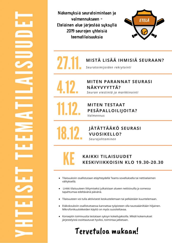 Näkemyksiä seuratoimintaan ja valmennukseen – Eteläinen alue järjestää seurojen yhteisiä teematilaisuuksia. Luvassa on ennen joulua neljä kokeilujaksoa.