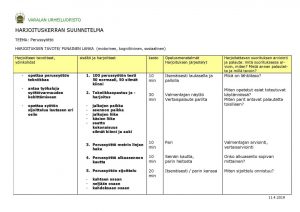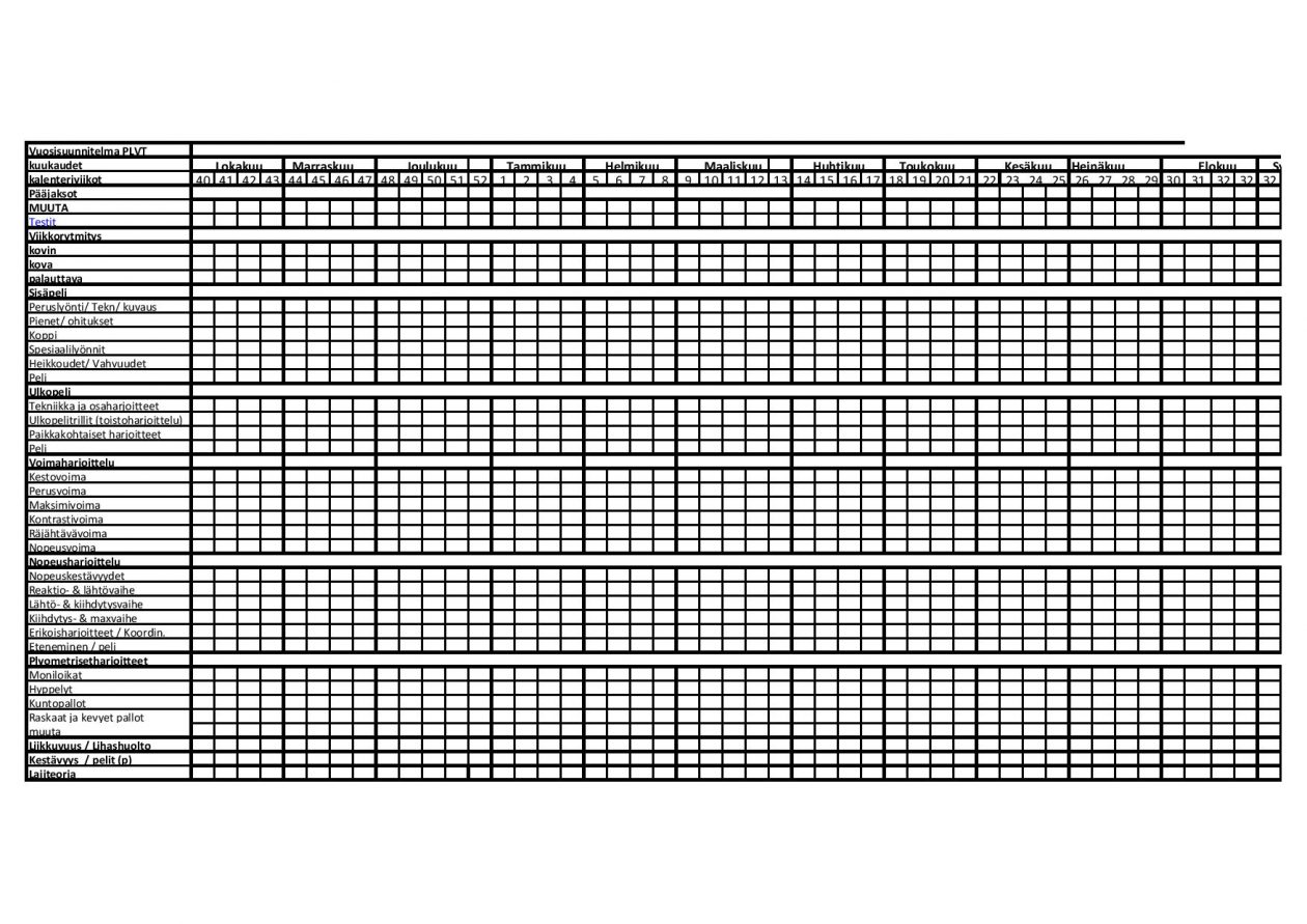 Yksittäisen harjoituksen suunnitelmaa kannattaa laventaa viikko-, kuukausi- ja vuosisuunnitelmiksi. Toisessa kuvassa on esimerkki tyhjästä vuosisuunnitelmasta