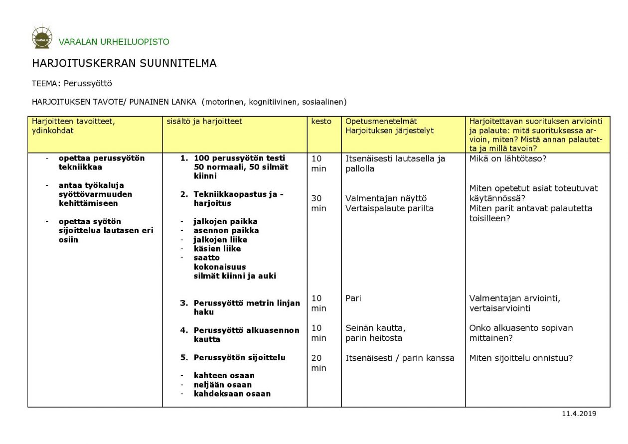 Valmentajan on syytä suunnitella harjoitus hyvin. Kun harjoitukset on dokumentoitu huolella, auttaa se valmentajaa seuraamaan joukkueen ja yksittäisen pelaajan kehitystä. Koko seuraa ajatellen dokumentoinnista on hyötyä esimerkiksi uusia valmentajia rekryoidessa. Kaikkea ei tarvitse tehdä uudelleen. Kuvassa on Vuokatin yläkoululeirityksen harjoitussuunnitelma, jonka perustana oli perussyöttö.