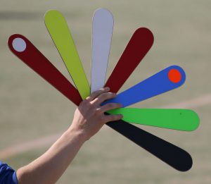 - Värin tai viuhkan suunnat (esim. pelinjohtajaa päin / pesää kohti / syötönvalvojaan päin)