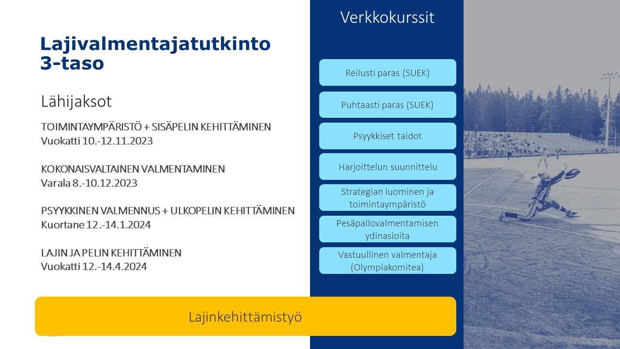 ⚾ Lajivalmentajatutkinto koostuu neljästä lähiviikonlopusta, seitsemästä verkkokurssista ja lajinkehittämistyöstä
