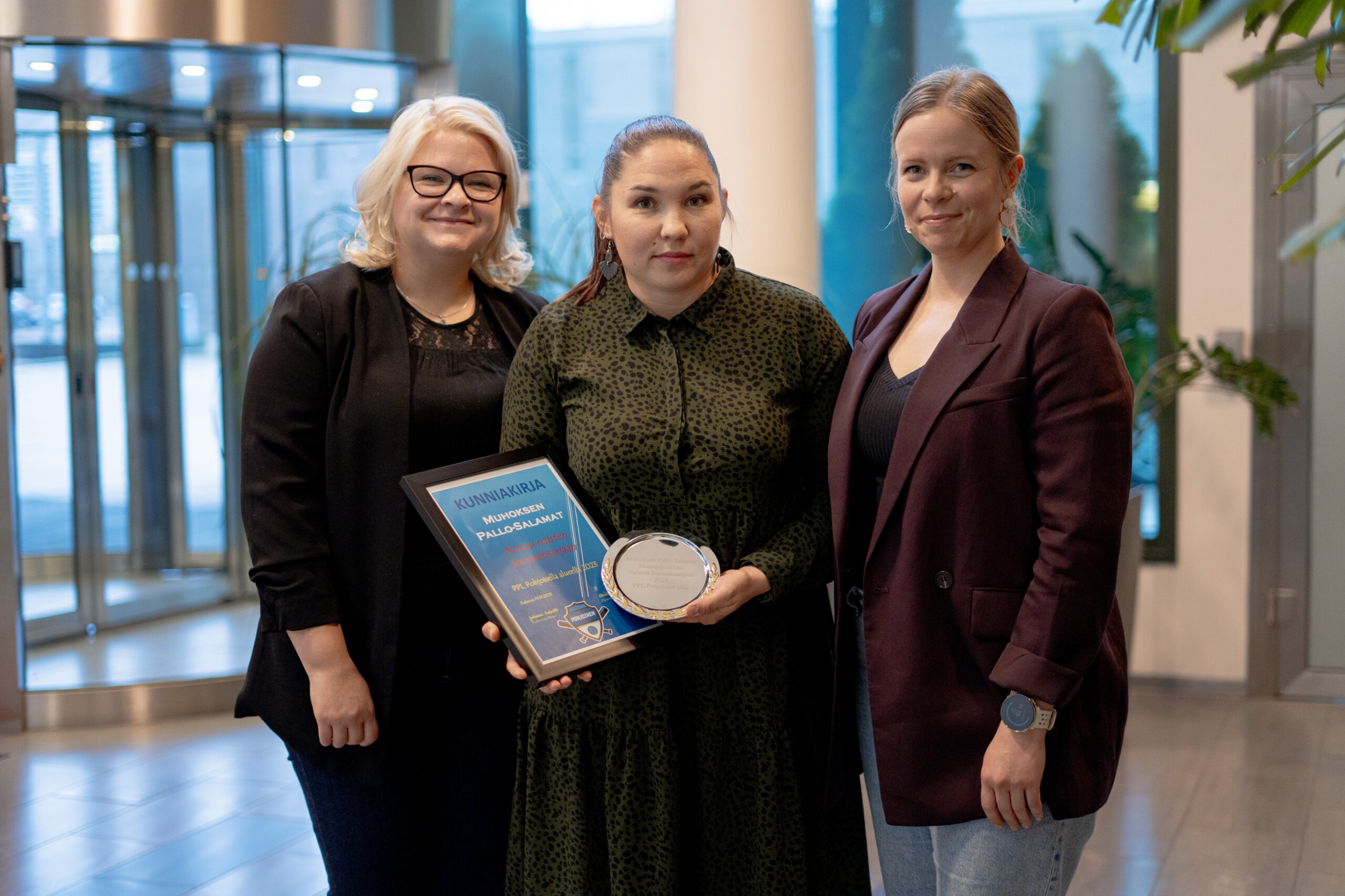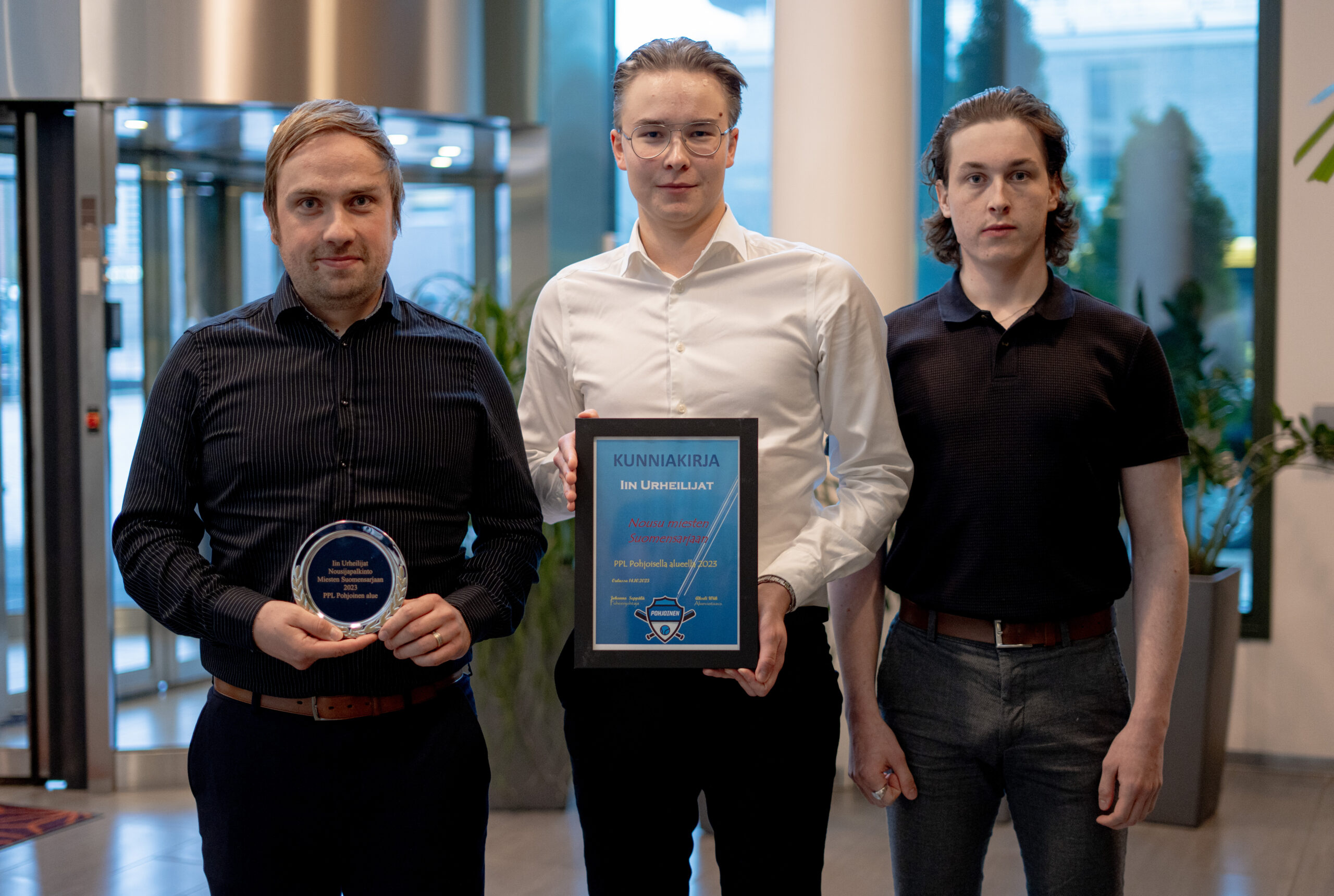 Sotkamon Jymyn joukkueesta palkinnon vastaanottivat Iivari Vihanto, Roope Korhonen sekä Samuel Huotari.