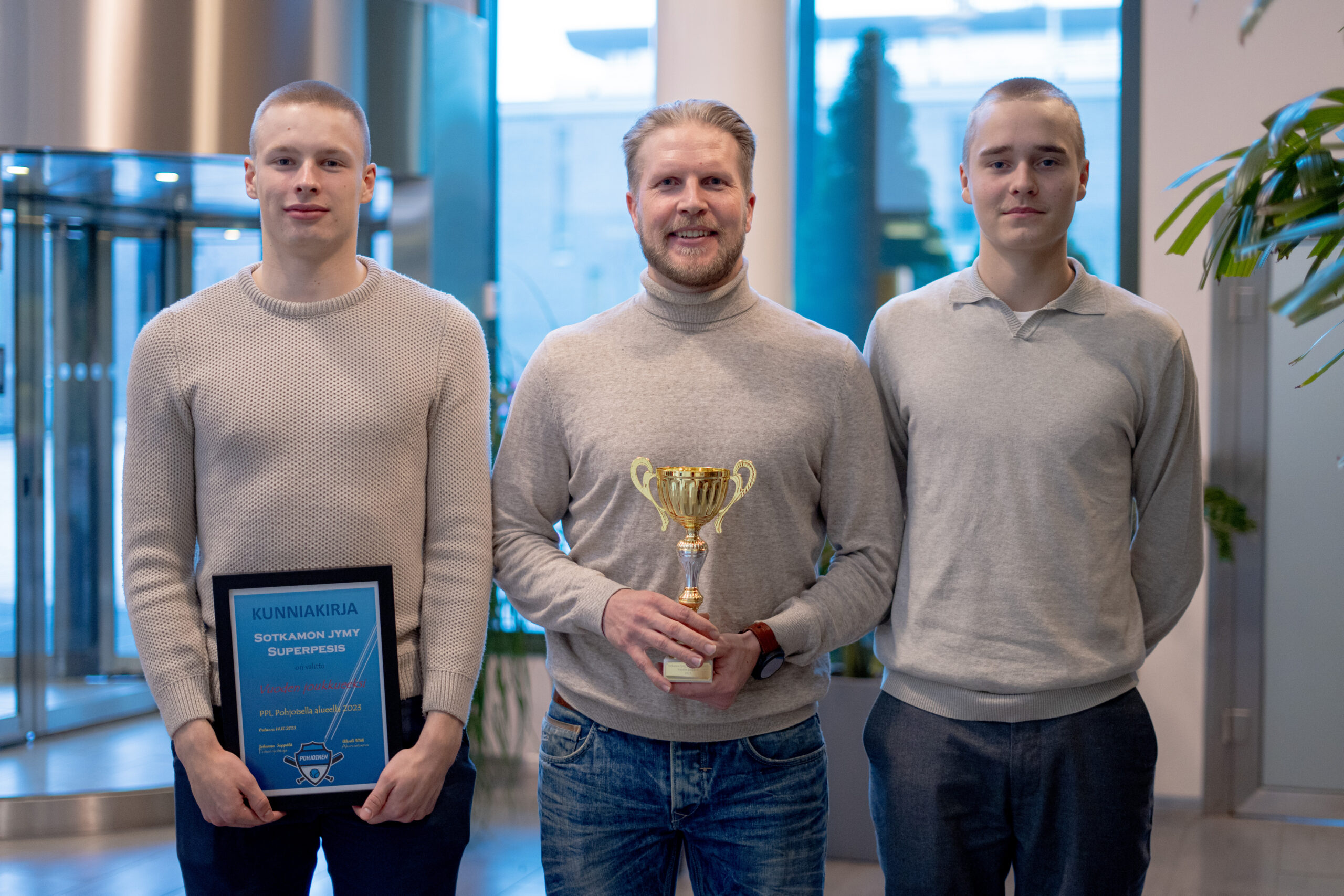 Sotkamon Jymyn joukkueesta palkinnon vastaanottivat Iivari Vihanto, Roope Korhonen sekä Samuel Huotari.