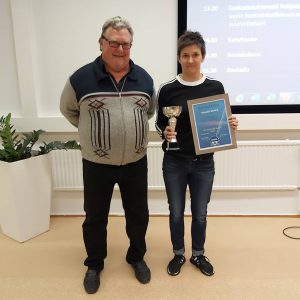 Maaru Seppä Iistä oli vuoden juniorivalmentaja. Vieressä uunituore Pohjoisen alueen johtoryhmän puheenjohtaja Jussi Meriläinen.