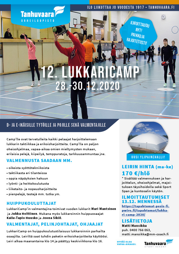 D- ja E-ikäisille tytöille ja pojille sekä valmentajille tarkoitettu LukkariCamp järjestetään tulevana joulukuuna Tanhuvaarassa jo 12. kerran. 28.12.-30.12.2020 aikana pidettävällä leirillä pääsee harjoittelemaan muun muasssa lukkarin taktiikkaa ja erikoisharjoitteita. Valmentajille, pelinjohtajille ja ohjaajille LukkariCamp on huipputilaisuus saada koulutusta lukkaroinnin parhailta osaajilta. Leiriltä saa käyttöönsä tuhdin paketin erikoisharjoitteita.