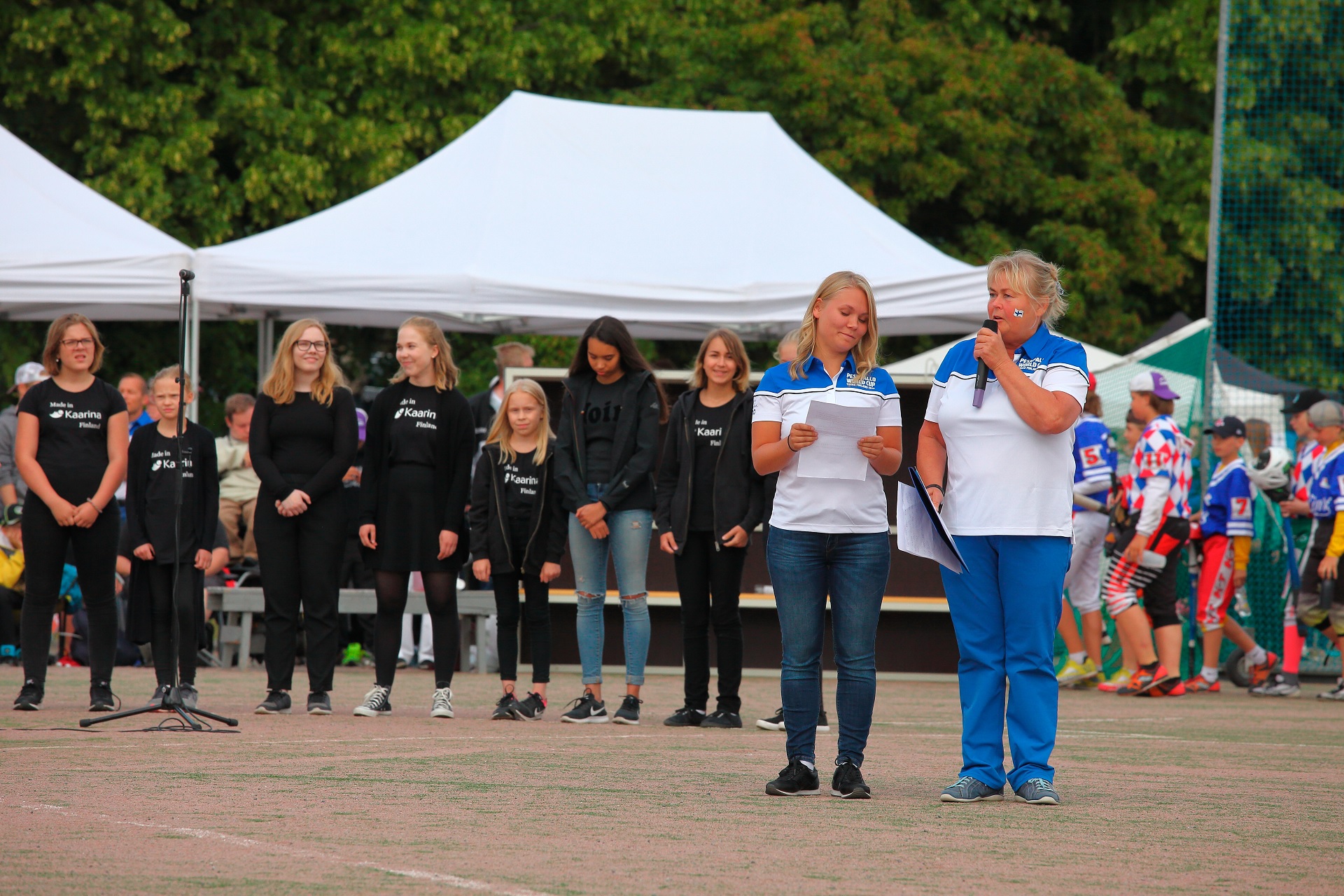 Varsinais-Suomen Pesiksen Ilona Näätänen ja Satu Mikola puhuivat Turun World Cup -turnauksen avajaisissa 2017. Kuva: Teemu Kekola