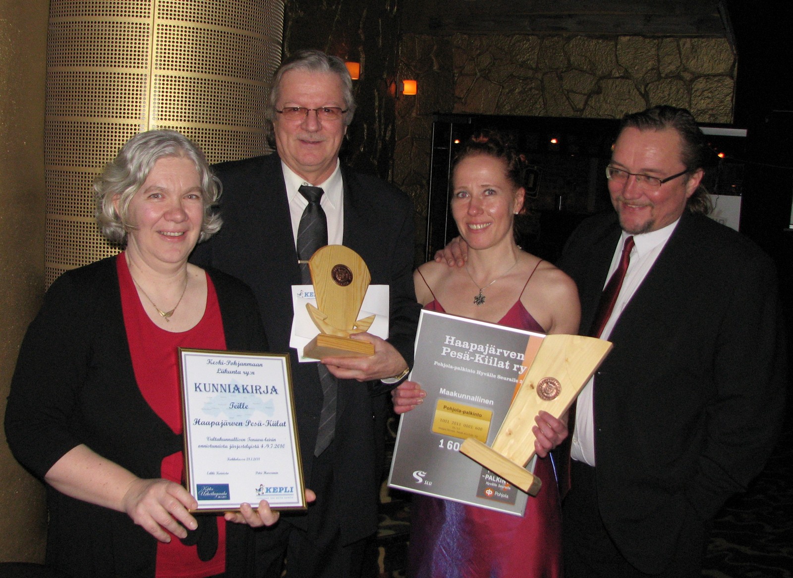 Uran varrelle mahtuu monenlaista palkintosadetta: Keski-Pohjanmaan Urheilugaalan 2011 juhlahumussa Pesä-Kiilojen Maria Laurila, Seppo Mustonen ja Jaana Ojaniemi sekä Pesäpalloliiton Arto Ojaniemi. Kuva: Haapajärven Pesä-Kiilat