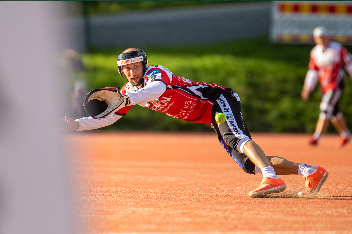 Huikeat ulkopelisuoritukset kuuluvat pesäpallo-otteluiden hienouksiin. Yleisö sai ihastella useita Joonas Eirolan taidonnäytteitä kesän otteluissa. Kuva: Juuso Koro