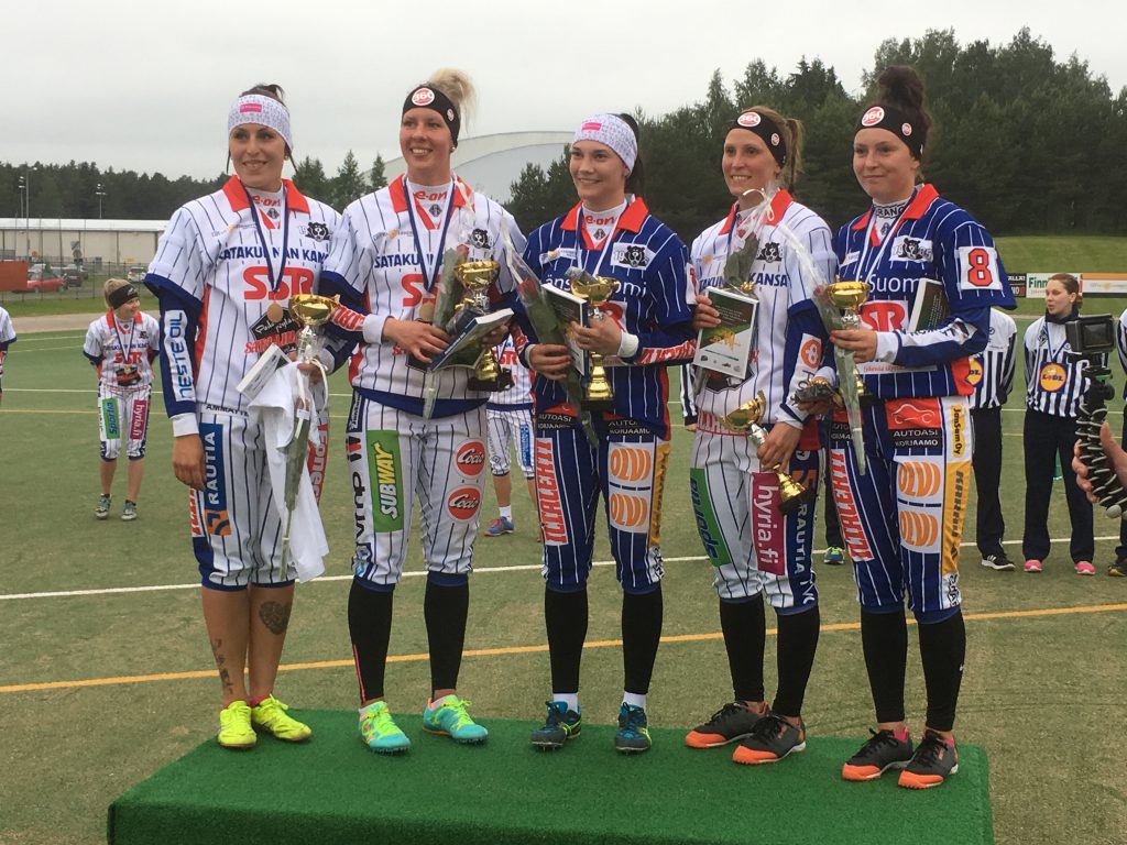 Porin Liitto-Lehdistö-ottelun 2016: palkitut: Kentän paras Kaisa-Maija Rosvall, Lehdistön ykköspalkittu Virpi Hukka, Liiton ykköspalkittu Miia Karppanen (nyk. Tervonen), Lehdistön kakkospalkittu Marjukka Urpelainen ja Liiton kakkospalkittu Noora Patrikainen (nyk. Matikka).