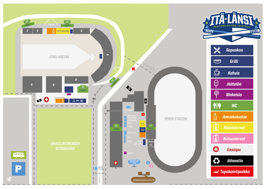 Erku-Areena sijaitsee Porin urheilukeskuksen alueella osoitteessa Metsämiehenkatu 19, 28500 Pori. Mikäli mahdollista, oma auto kannattaa jättää kauemmaksi ja saapua paikan päälle kävellen tai pyörällä.