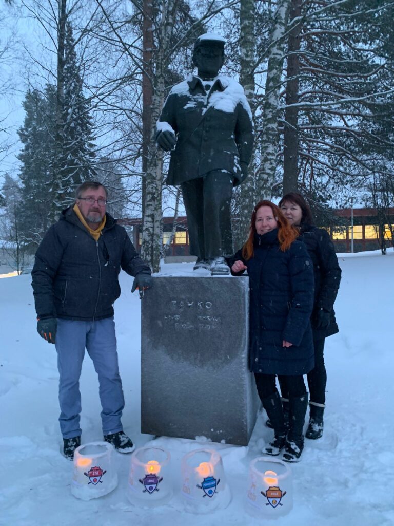 Arto Ojaniemi, Jaana Ojaniemi ja Marika Kuosmanen vierailivat Pihtiputaalla Lauri ”Tahko” Pihkalan syntymäpäivänä.