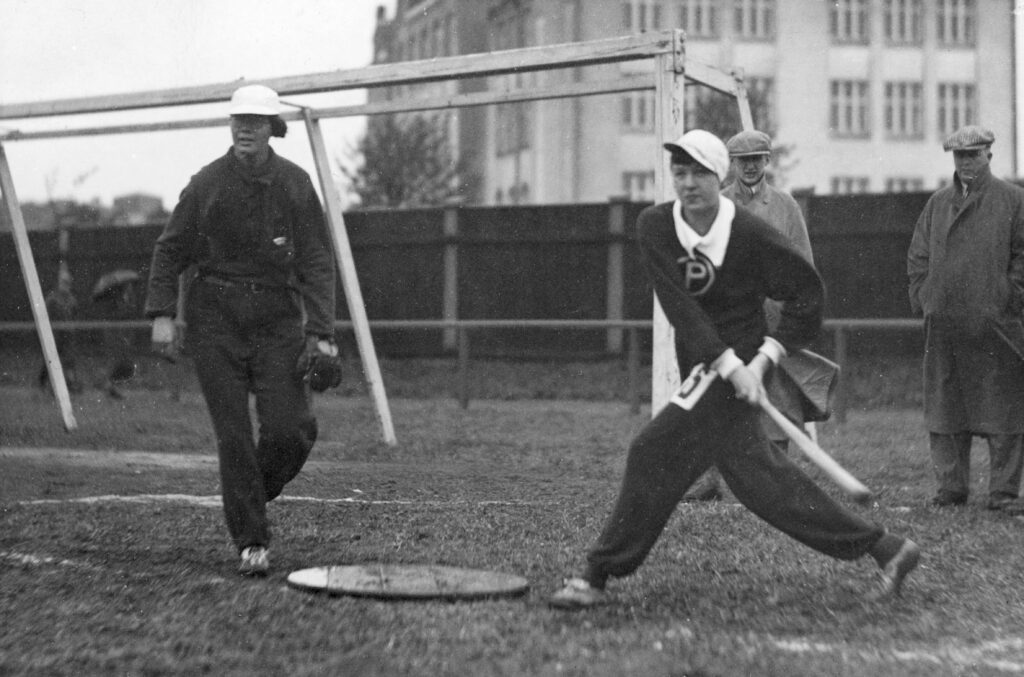Aino Liimatainen lyömässä Helsingin Pallonlyöjien lukkari Lempi Hartikan syötöstä vuonna 1933. Jutun kuvat: Aino Liimataisen lähiomaiset, valokuvat on luovutettu Suomen Urheilumuseolle ja Suomen Pesäpalloliitolle v. 2021.