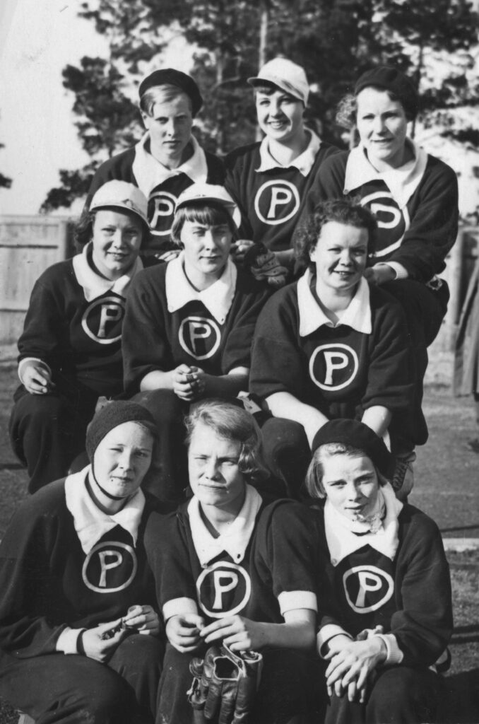 Tampereen Pyrinnön vuoden 1933 mestarijoukkue. Eturivissä vasemmalta Liisa Salmi, Suoma Kaipola ja Valma Hakala. Keskirivissä Tarja Wahlman, Eeva Peltonen ja Majlis Arasalo (Ahlfors). Takarivissä Marjatta Lietsamo (Lindstedt), Aino Liimatainen ja Laina Lahtinen.
