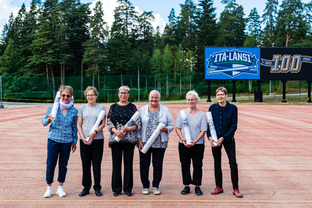Pesäpallon kunniagalleriaan valitut Tampereen Itä-Lännessä kesällä 2022. Vasemmalta: Henna Salminen, Riitta Rajamäki, Marita Karhunen, Tarja Pöntinen, Marja Solakivi, Mirja Valtonen (Aino Liimataisen tytär). Kuva: Juuso Koro