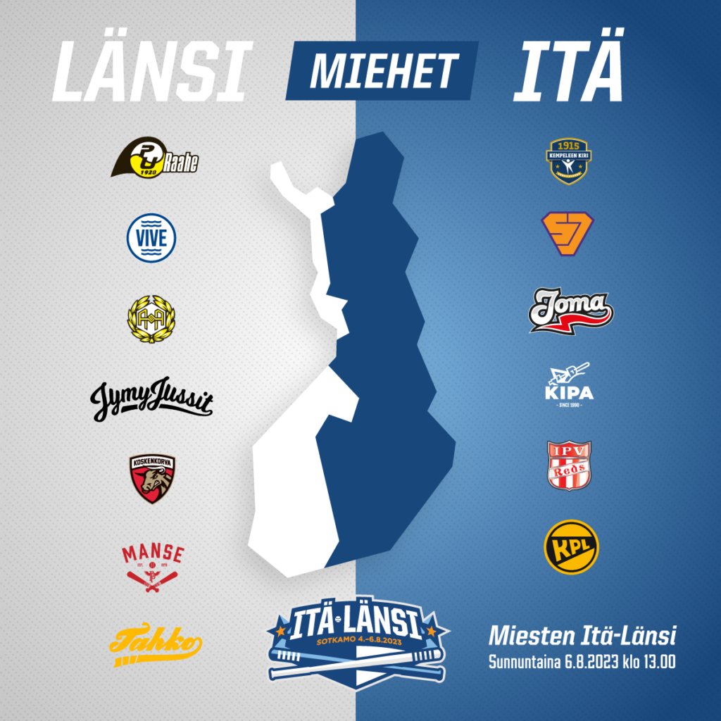 Itä-Länsi pelataan Sotkamossa 4.–6.8. Tähdistöottelut pelataan Kainuussa nyt kuudetta kertaa, edellisen kerran Sotkamossa on pelattu Itä-Länsi vuonna 2012. Poikien ottelu pelataan perjantaina 4.8. klo 13.30. Perjantaina pelataan myös Superpesis-ottelu Sotkamon Jymy–Manse PP klo 18.